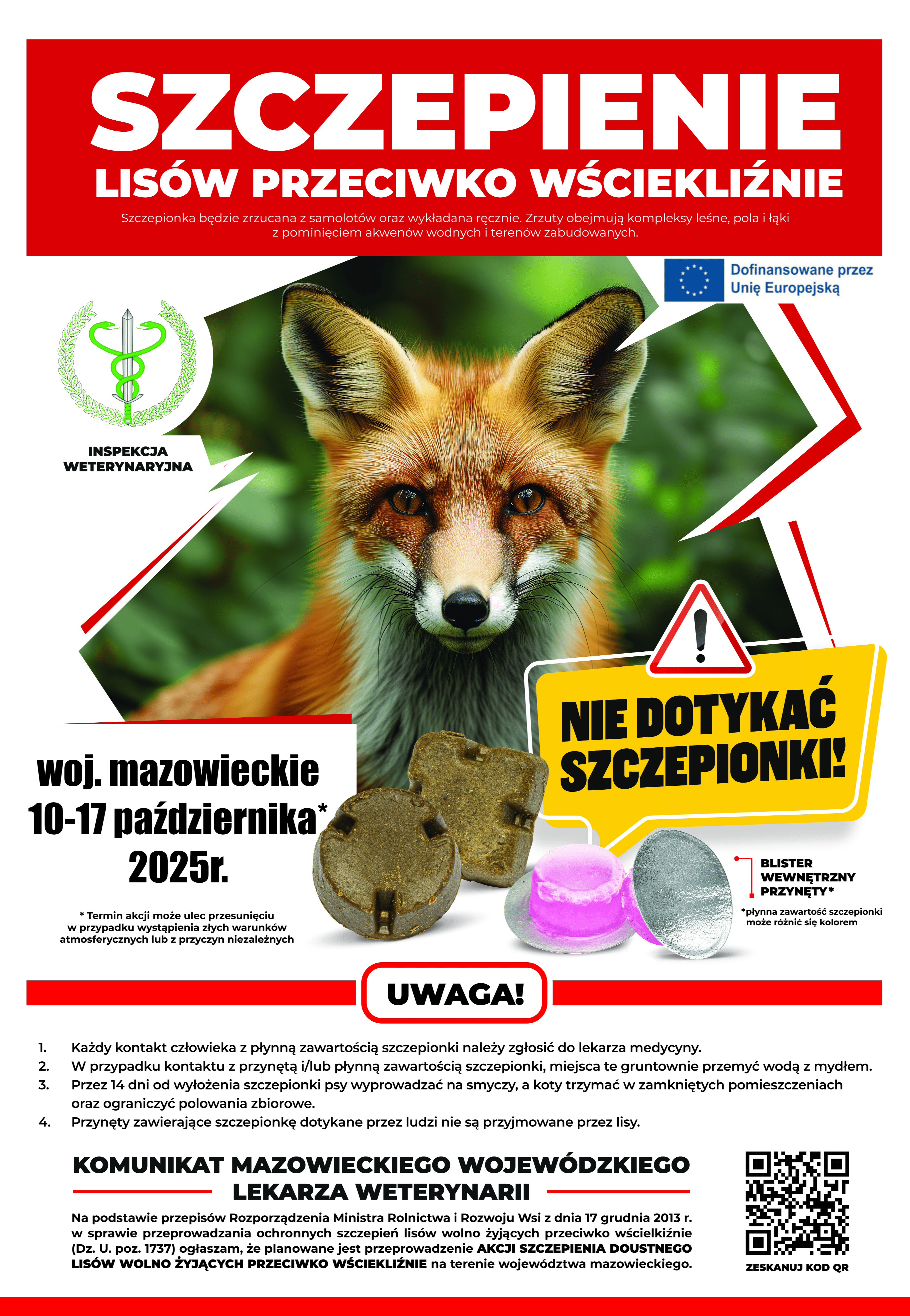 że, w dniach 10 - 17 października 2025 r. na terenie województwa mazowieckiego przeprowadzone zostanie ochronne szczepienie lisów wolno żyjących doustną szczepionką RABADROP